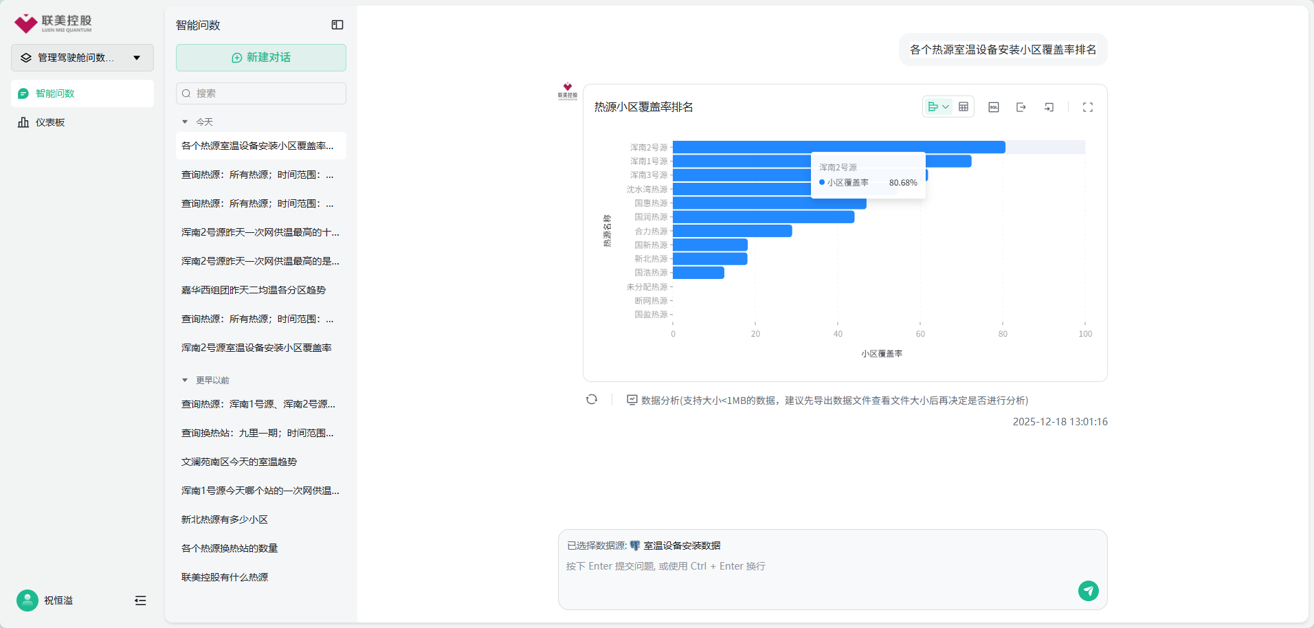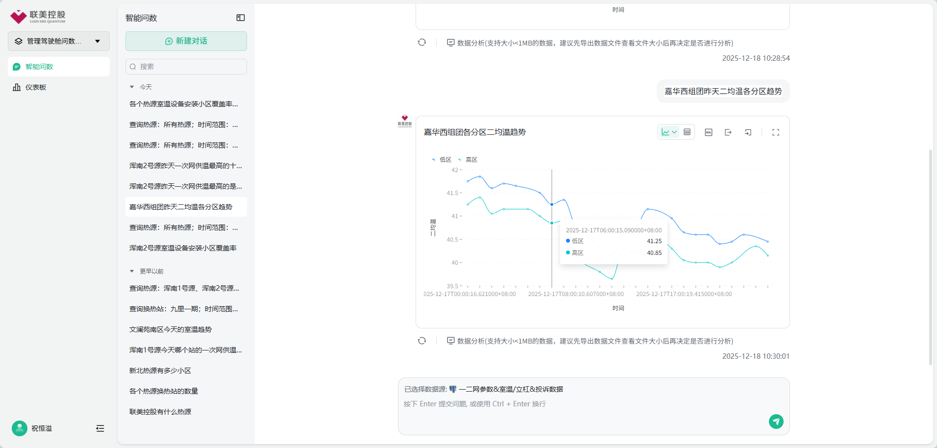 其颠覆性在于,它改变了人与数据的交互方式。未来,管理者无需在不同系统间切换、手动筛选和整理数据,只需通过自然语言提出诸如“查看昨日A片区二次网平均温度”、“分析当前报修工单的热点区域”等问题,AI智能体便能在10秒至50秒内,自动调取、关联分析来自一次网、二次网、室温采集点、客服工单等多个维度的数据,并提供结构化的分析结果与洞察建议。![]()